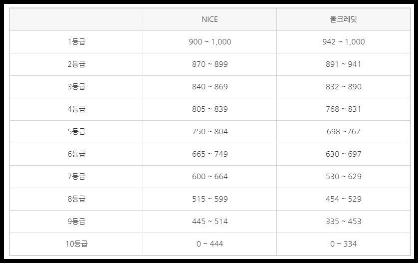 신용등급 단계의 기준표입니다. 나이스 지키미와 올크레딧의 산정기준입니다. 과거에는 등급별로 차등이 있어, 1~2점차로 등급이 바뀌어 손해를 보았지만, 현재는 포인트제로 바뀌어 많은 사람들이 구제를 받고 있습니다. 그래도 기준등급은 잘 지키는게 좋습니다.